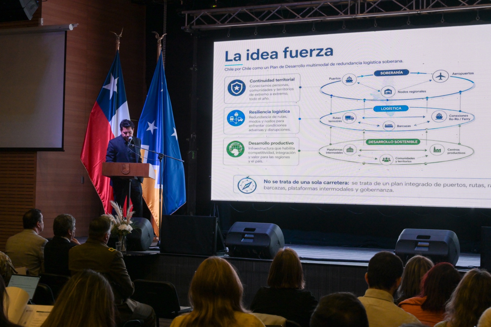 Al ser una iniciativa bimodal (terrestre y marítima), el rol de la infraestructura portuaria adquiere una posición distinta. Fue un tema que abordó, después, Miguel Palma, gerente general de la Empresa Portuaria Austral.
